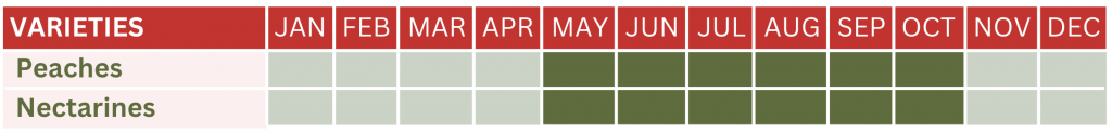 Lebanese peaches and nectarines are available from May to October. As such the season is completely opposite to that of South Africa, an important supplier of these kinds of stone fruits, and a bit longer than that of Spain, Jordan, and Tunisia.